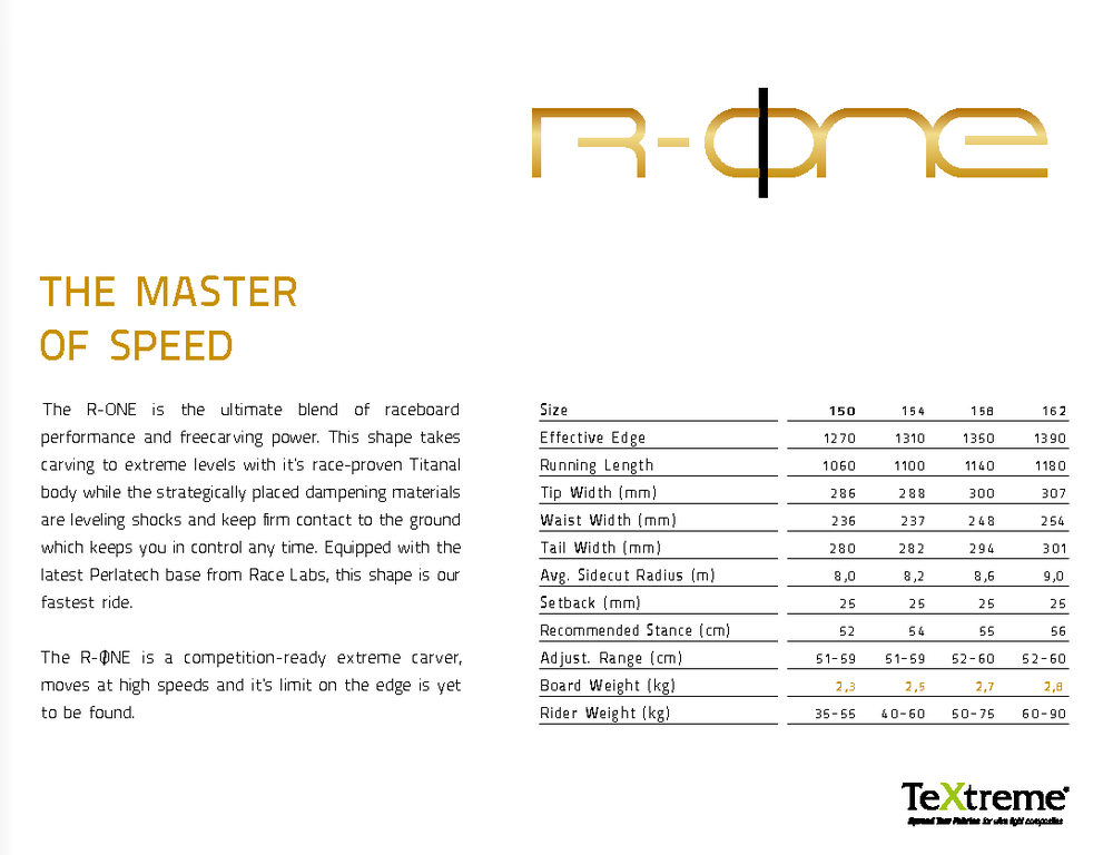 지금까지 당신이 타던 어떤 보드든 R-ONE과는 차이가 있을 것입니다. R-ONE 어떤 지형도 공략할 수 있습니다. 레이스 시합에서 축적 된 사이드 컷 쉐이핑 기술은 턴을 할 때마다 놀라움을 선사합니다.